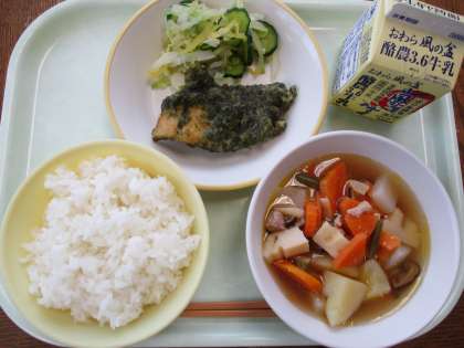 5月18日今日の献立は、ごはん、牛乳、魚の磯辺揚げ、あわせ和え、筑前だきです。