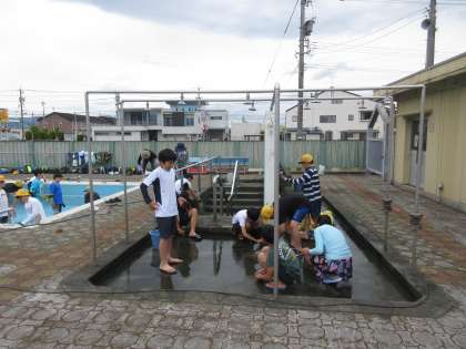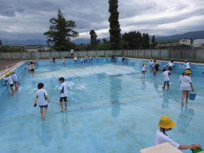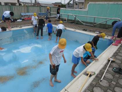 来月のプール開きに向けて、プール清掃を行いました。1年間で溜まった汚れをブラシで一生懸命こすり、きれいなプールになりました。