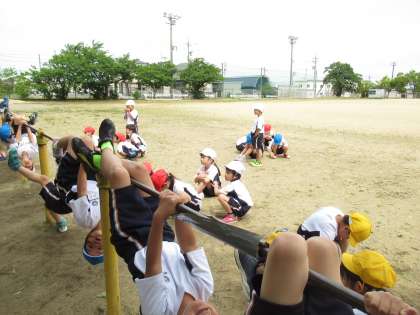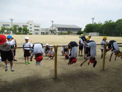 体育科では、鉄棒の学習を始めました。「ふとんほし」「ぶたのまるやき」という技に挑戦しました。
