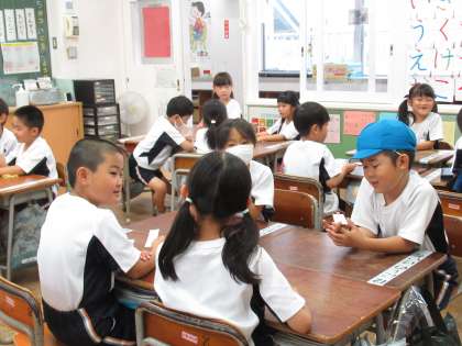 配られたカードに、「好きな動物はなんですか。その理由も教えてください」などのテーマが書かれています。テーマに沿って、聞く人に伝わるように簡潔に話すトレーニングを行いました。友達の話を聞いてうなづくなどの姿が見られました。