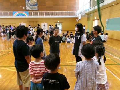 今年度初めてのなかよし集会が行われました。明日から始まる「縦割り班清掃」の顔合わせです。今日は、初めての相手とも仲良くなれるように、自己紹介やジェスチャーゲームを行いました。6年生は、列に並ばせたり低学年の子が答えやすいようにフォローしたりと自分で考えて行動しました。