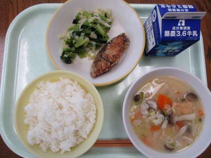 6月2日今日の献立は、ごはん、牛乳、魚の竜田揚げ、小松菜ひたし、呉汁です。