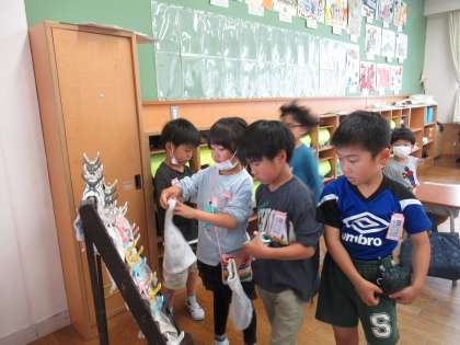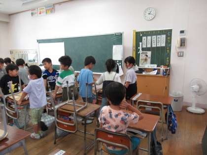 1年生のクラス清掃の様子です。友達と2人で机を運んだり、ぞうきんを上手にぞうきんかけにかけようとしたりしています。がんばっています!