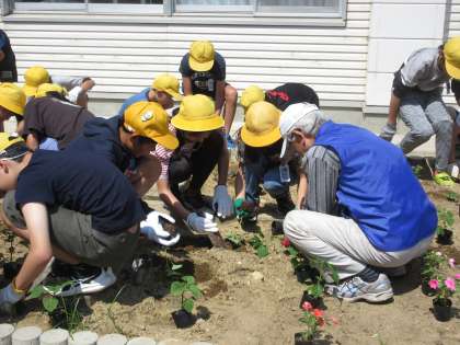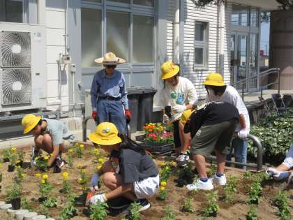 校舎前花壇の花苗植えを行いました。栽培委員会を中心に考えたデザインをもとに、花苗を丁寧に植えました。今年も美しい花壇になることを期待しています。