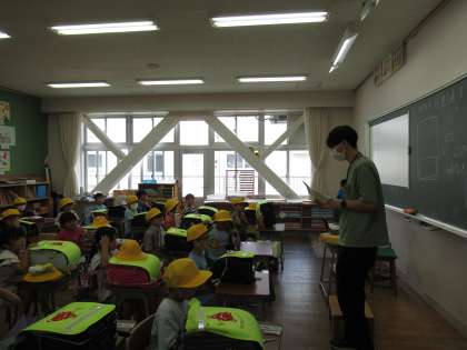 下校の前に、帰りの会をします。きらきらタイムでは、友達のよかったところを見つけて発表したり、先生からのお知らせや話を聞いたりします。子供たちは、落ち着いて取り組んでいます。