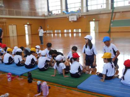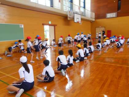 5年生が、反復横跳びで、「3本とも線をこえるんだよ。」とお手本を見せて教えてくれたり、「もう少し、がんばれ。」と応援してくれたりしたので、2年生は頑張って取り組みました。