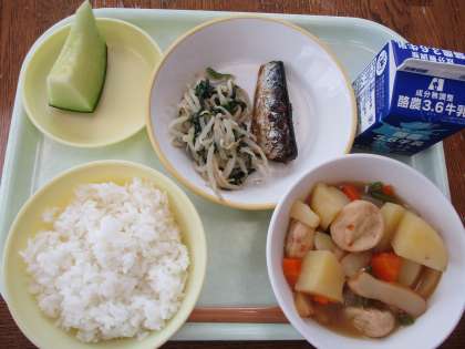 6月14日今日の献立は、ごはん、牛乳、いわしの生姜味、ほうれん草のごま和え、関東だき、メロンです。