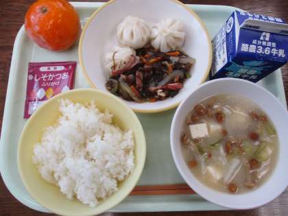 6月15日今日の献立は、ごはん、牛乳、えびパオツ、もずくのチャプチェ、なめこ汁、しそかつおふりかけ、冷凍みかんです。