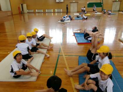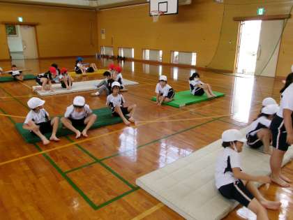 体育では、マット運動の勉強が始まりました。マットの上で揺れたり起き上がったりなど、基本の動きを上手に行っていました。