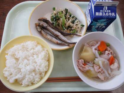 今日の給食は、「かみかみ献立」です。カルシウムがたくさんとれるように、牛乳、ししゃも、切り干し大根、小松菜、ごま等が使われています。カルシウムは、強い歯や骨をつくる大事な栄養素で、牛乳やチーズなどの乳製品をはじめ、小魚や大豆製品等にも多く含まれています。成長期の子供にとっては、骨をつくる大事な時期なので、大人以上にたくさんのカルシウムが必要です。今日の給食では、一日に必要なカルシウムの半分以上がとれるように献立を工夫しています。