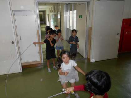 大縄をしたり、算数ボックスのものを使って遊んだりと、室内で楽しく遊んでいました。