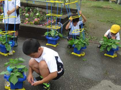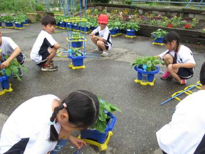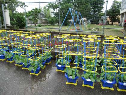 あさがおのくきが伸びてきました。つるも出始めました。そこで、支柱を立てました。あさがおが成長しています。