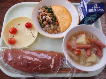6月19日今日の献立は、ココアコッペパン、牛乳、チーズオムレツ、きのこと豆のアヒージョ、ポトフ、サクランボです。