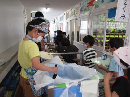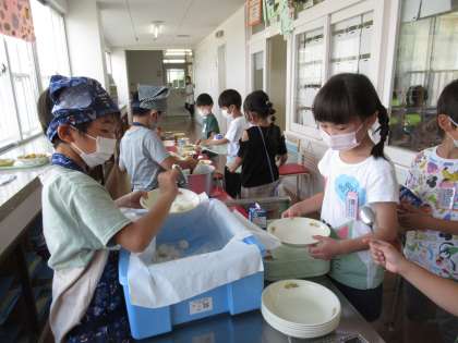 今日の給食は、子供たちに人気のカレーライスです。子供たちは、おかわりもしてたくさん食べました。