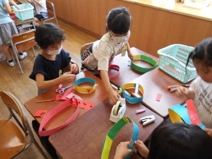 色々な長さの画用紙を組み合わせたり切ったりと、自分の作りたいイメージに合わせて工夫していました。