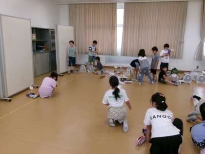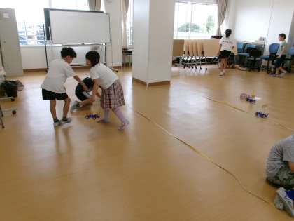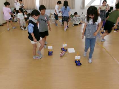 理科では、風とゴムについて学習しており、風やゴムの力で車がどれくらい進むのかを測定しています。力の強さを変えることで、物の動き方がどのように変わるかを考えています。