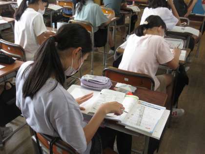算数の学習では、「分数のわり算」や「分数の倍」の学習に取り組んでいます。問題をしっかりと読み、丁寧に計算に取り組んでいます。