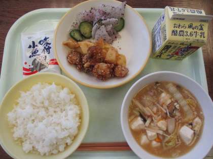 7月4日今日の献立は、ごはん、牛乳、ほたてとじゃがいものごまからめ、ゆかり和え、豆腐の野菜あんかけ、味付け小魚です。