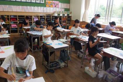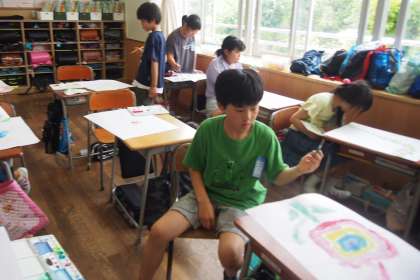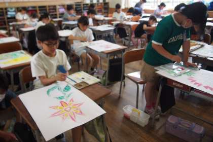 図工では、自分たちが考えた「まぼろしの花」を描いています。