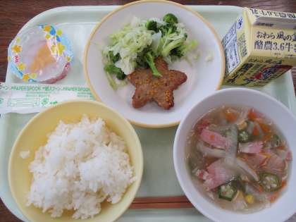 今日は、「七夕の日」の献立です。星の形をしたハンバーグ、春雨を天の川に見立てオクラを星に見立てた天の川スープを出しました。七夕ゼリーは、流れる星をかたどったトッピングがしてあります。夜の星空をイメージした献立です。