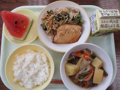 7月6日今日の献立は、ごはん、牛乳、肉じゃが、さばの塩焼き、いり大豆和え、すいかです。