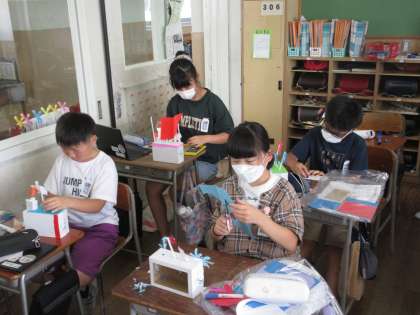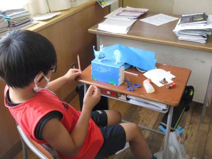 図画工作科の学習では、クランクの仕組みを使った作品づくりを行っています。クランクの動きを海の生き物が泳いでいる様子に見立てたり、宇宙飛行士の動きを表したりする姿が見られました。