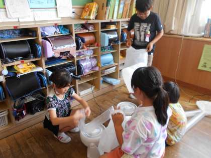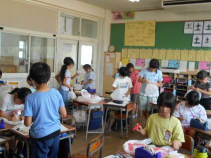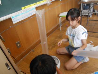 色々な種類の袋を使って、風で飛ばせる作品をつくっています。袋をしばったり、つなげたり、飾りをつけるなど、それぞれが工夫して楽しめる作品をつくっています。