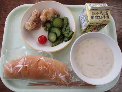7月10日今日の献立は、コッペパン、牛乳、フライドチキン、アスパラサラダ、ビーンズポタージュ、ミニトマトです。