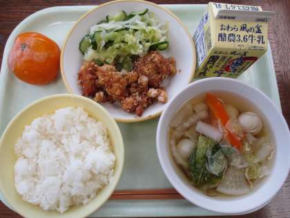 7月19日今日の献立は、ごはん、牛乳、豚肉と大豆のみそからめ、きざみ和え、つみれ汁、冷凍みかんです。