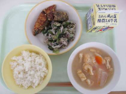今日の献立は、ごはん、牛乳、魚の竜田揚げ、梅肉和え、白玉汁です。