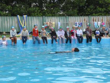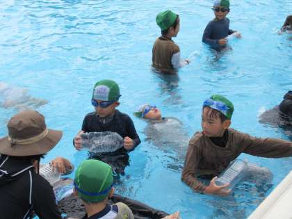 先週、プールで着衣泳をしました。どきどきしながら取り組みました。「だんだん、服が重たくなったよ」「ペットボトルを持つと体が軽くなったよ」などの声も聞かれました。