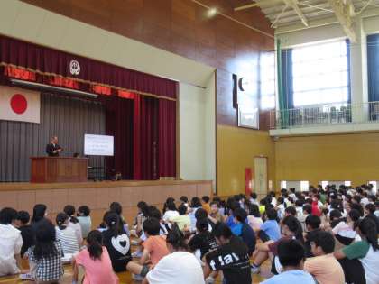 1年生にとって、初めての終業式です。体育館で校長先生からのお話を聞きました。その後、教室で、meetをつないで夏休みの安全な過ごし方を生徒指導の先生から聞きました。