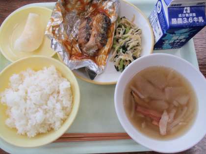 8月30日今日の献立は、ごはん、牛乳、さばの銀紙焼き、はりはり和え、冬瓜スープ、梨です。