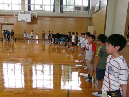 10月に行われる第4区域音楽会に向けて、いよいよ学年での合唱練習が始まりました。今日は第1回目だったので、歌うときの姿勢や発声練習について学びました。きれいな歌声を聴く人に届ける気持ちで、みんなとても素敵な表情で歌声を響かせていました。