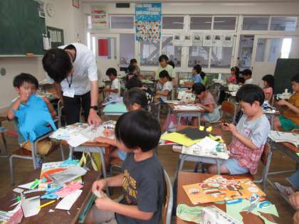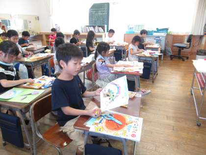 図工科では「いろいろなかたちのかみから」の学習をしています。箱や牛乳パックなどを開き、紙の形から、表したいことを考えて絵をかいていました。楽しく取り組むことができました。