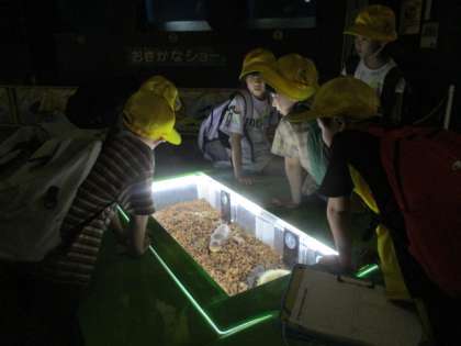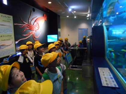 魚津水族館では富山湾に生息する魚をはじめとして、たくさんの魚や生物の見学をしました。大水槽に泳いでいる大型の魚には子供たちも驚いていました。