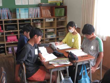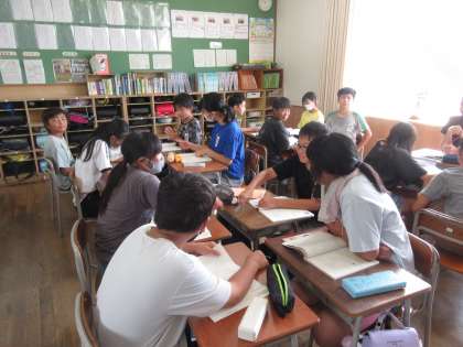 国語の学習では、詩「せんねんまんねん」の音読をしました。班で表現の工夫の仕方を話し合い、発表をしました。写真は、班ごとに工夫を考えている様子です。