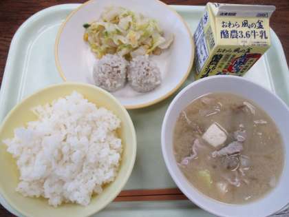9月6日今日の献立は、ごはん、牛乳、珍珠丸子(チンジュワンズ)、コーン和え、さつま汁です。