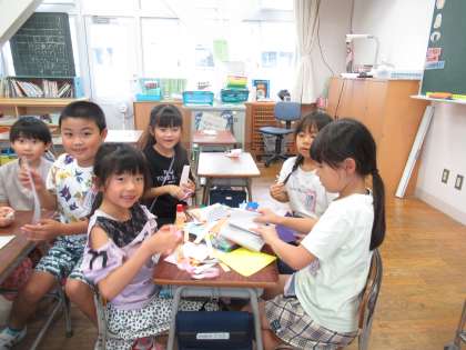 係活動を楽しんでいます。工作係は、教室を明るくしようと飾りを作り始めました。