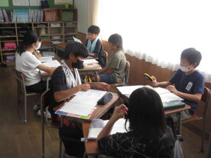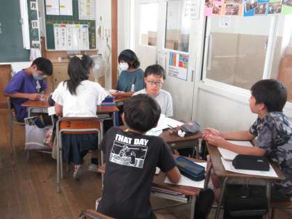 国語科の授業では、「対話の練習」を行いました。総合的な学習の時間で行っている「リーダープロジェクト」について、それぞれ調べた内容を伝え合い、考えを広げました。