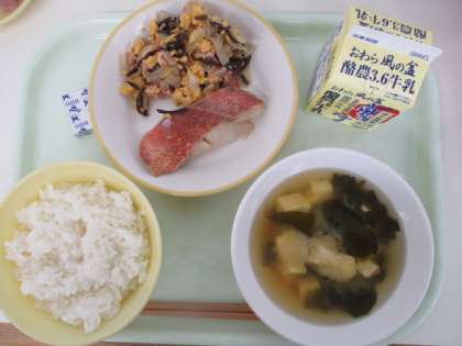 9月19日(火)今日の給食 公開日 2023/09/19 更新日 2023/09/19 給食室から 9月19日今日の献立は、ごはん、牛乳、赤魚の塩焼き、卵ときくらげの炒め物、みそ汁、ポケットチーズです。 きくらげは、きのこの仲間です。不足しやすいビタミンDや食物繊維、鉄分等が多く含まれるきくらげが、卵と一緒に炒められ、ご飯が進む献立でした。 今日もおいしくいただきました。