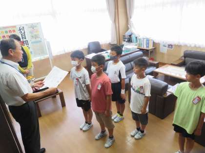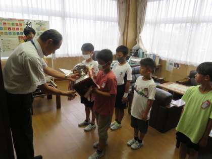 先日、サッカーで優勝した試合に出場した3年生が表彰されました。 表彰式の様子です。