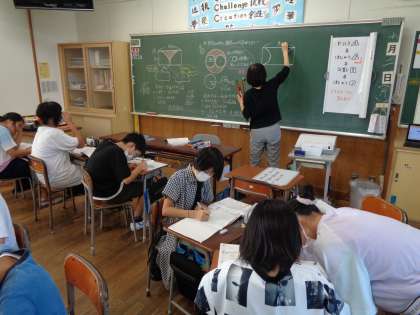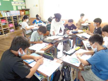 算数の学習では、円の面積の求め方を使って、複雑な形の面積を求めています。今日の学習でも自分で進め方を決めて、教科書やドリルの問題に挑戦しました。