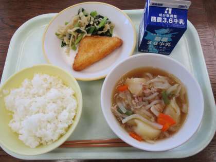 10月4日今日の献立は、ごはん、牛乳、はんぺんフライ、はりはり和え、肉じゃがです。
