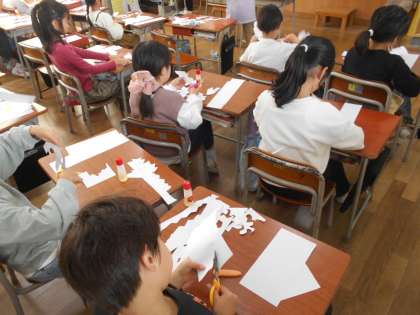 「すべり台に見える!」「ぐるぐるに回して切ったら台風みたい!」など想像を膨らませながら制作しました。