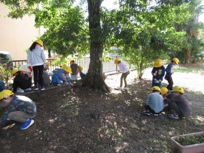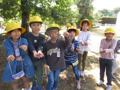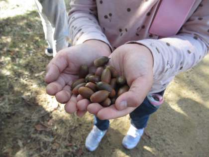 わんぱく広場で、どんぐりを見つけました。「こんなにいっぱい拾ったよ」「かわいいどんぐりだね」など、子供たちは楽しんでいました。拾ったどんぐりは、生活科で、おもちゃづくりに活用しようと思います。