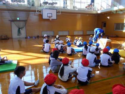 台上前転をするときに「みかん」「バナナ」と、体の形をフルーツに例えて意識しながら練習に励んでいます。