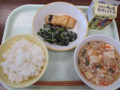 10月27日今日の献立は、ごはん、牛乳、揚げ魚のレモン味、よごし、厚揚げのそぼろにです。