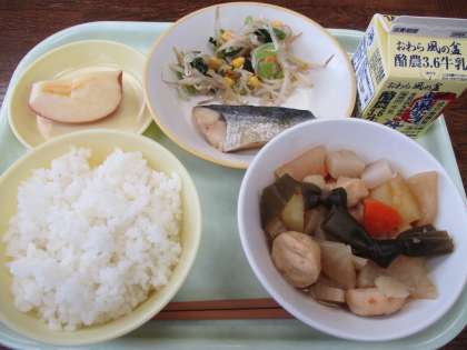 11月2日今日の献立は、ごはん、牛乳、鰆の塩焼き、コーン和え、おでん、りんごです。