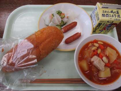 今日は、子供たちの給食アンケートで、ダントツ1位の「揚げパン」です。子供たちのリクエストに応えて調理員が心を込めて作った大久保小学校だけの特別献立です。揚げたコッペパンに、砂糖ときなこをまぶしてあり、甘くて香ばしく、さくっとした食感がとてもおいしさです。味わって食べました。